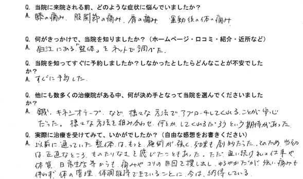 痛みがなくなるとともに、身体のバランスがよくなった。バランスを維持するためのストレッチなどのアドバイスも適宜受けられてありがたい。